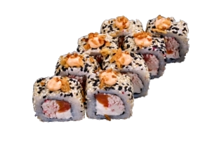 Рис, сливочный сыр, лосось, снежный краб, кунжут, спайси соус, лук фри